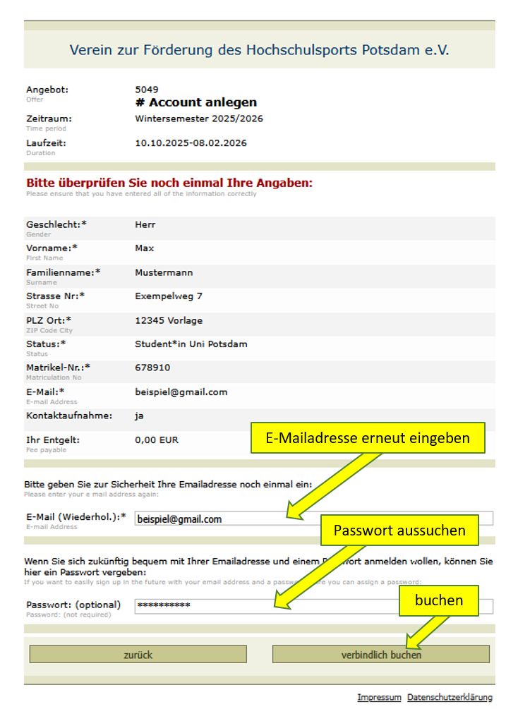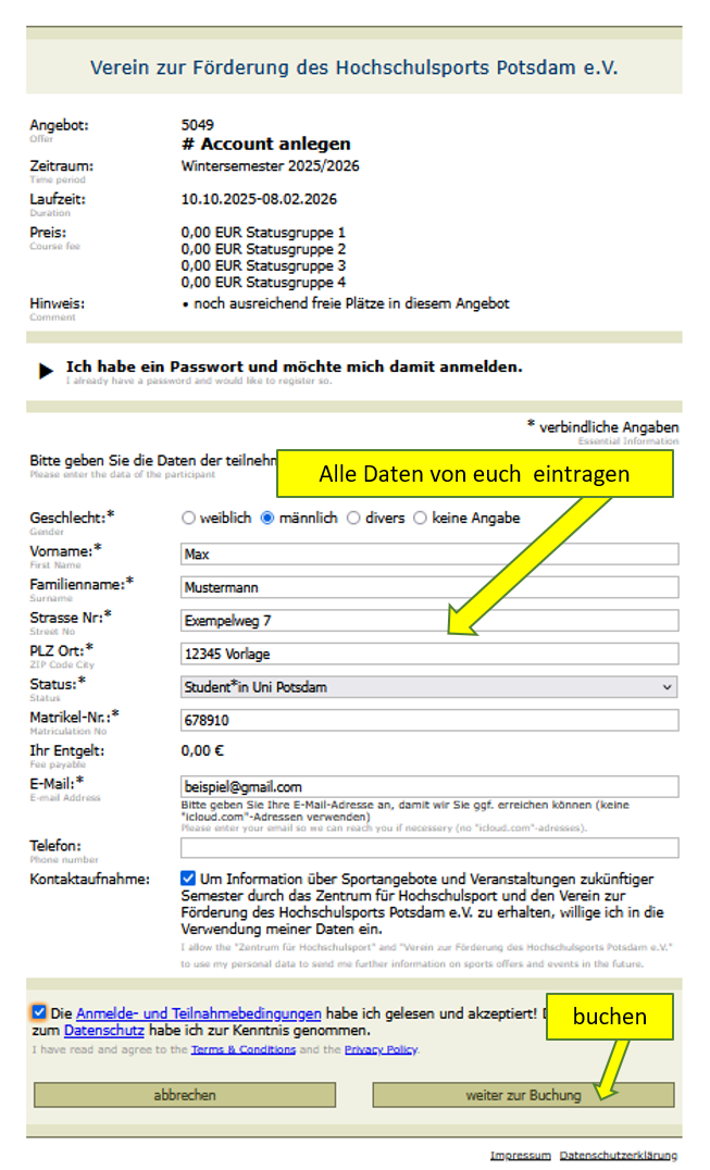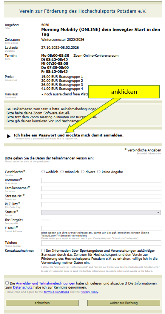 Da sich ein Account technisch nur nach einer ersten Buchung anlegen lässt, haben wir für euch einen Kurs namens "Account anlegen" eingerichtet. Dieser dient ausschließlich dazu, dass ihr jetzt schon euren persönlichen Zugang erstellen könnt – ganz ohne eine kostenpflichtige Buchung.